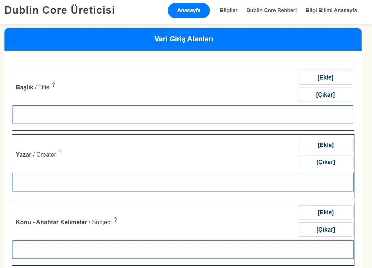 Dublin Core Metadata Üreticisi açık kaynak kullanılarak oluşturulmuştur sistem sayesinde Dublin Core elemetlerini XML – HTML – XHTML formatlarına kolaylıkla dönüştürebileceksiniz.
