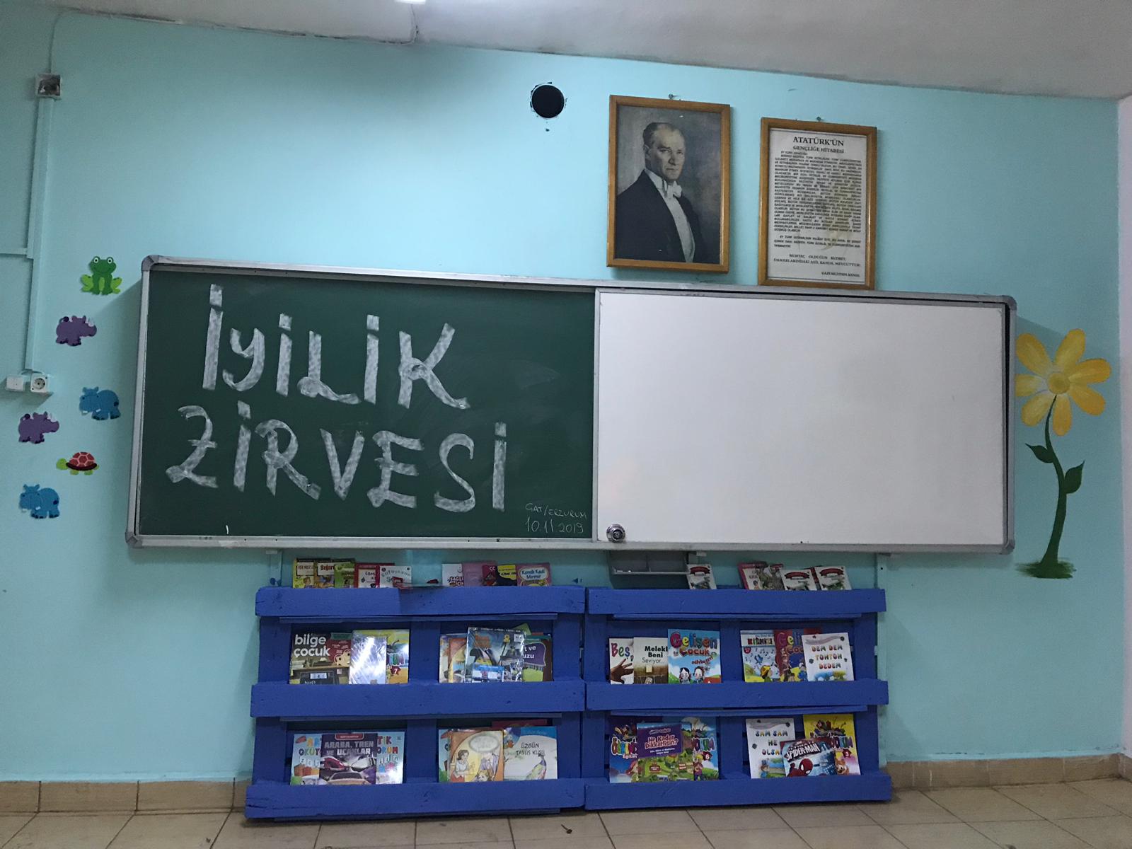 Erzurum’da sosyal sorumluluk kapsamında kurulan tamamı gönüllülerden oluşan İyilik Zirvesi 1-2-3 ve 4. sınıftan oluşan toplam 20 öğrenciye umut olmak, o küçük bedendeki koca yürekleri geleceğe hazırlamak için Erzurum ili Çat İlçesinden 19 km uzaklıktaki Kaplıca İlköğretim okuluna İyilik Zirvesi başkanı Dilan Yavuz aracılığıyla Şehit Teğmen Muhammed Kır adında kütüphane kurdu.
